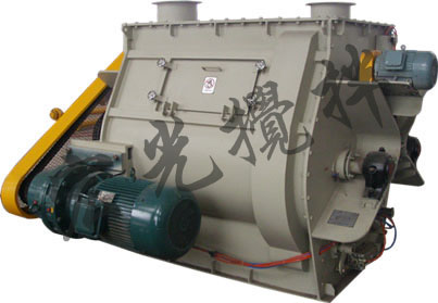 無重力混合機(jī)臥式雙U形筒體內(nèi)裝有一對(duì)雙向旋轉(zhuǎn)方向的主軸,主軸上裝有一定數(shù)量且具備一定角度的槳葉。